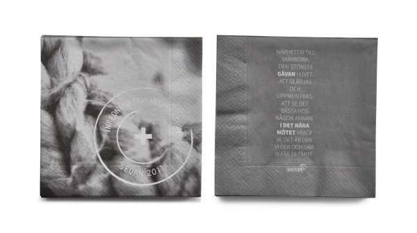 En servett med två sidor med olika motiv så du kan variera din dukning efter vad som passar bäst. Det är en gåva att få samlas med när och kära eller kanske ny bekantskap kring ett bord och dela gemenskap. Servetten har motiv av flätad ull med vårt sigill på en sida och den andra sidan står texten skriven;